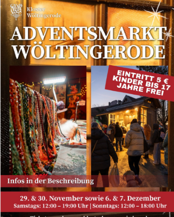 Im historischen Gemäuer des Klosters Wöltingerode kann man am 1. und 2. Advent einen Kunsthandwerkermarkt zum Stöbern entdecken. Festlich dekoriert und illuminiert wird der Klostergang warmes Vorweihnachtsfeeling verbreiten. Auch im Außenbereich gibt es zahlreiche, attraktive Angebote in (hoffentlich) frühwinterlicher Atmosphäre. Hinzu kommen die kulinarischen Köstlichkeiten eines Adventsmarkts, stimmungsvolle Livemusik sowie wintergerechte Angebote der benachbarten Klosterbrauerei. Der Eintritt kostet 5 €, Kinder bis 17 Jahren sowie Rollstuhlfahrer + Begleitperson sind frei. Veranstaltungsort ist Vienenburg. Weitere Infos siehe Instagrammeintrag des Klosterhotels Wöltingerode.