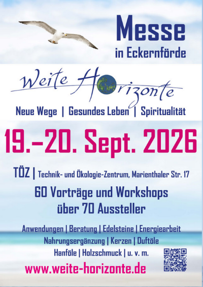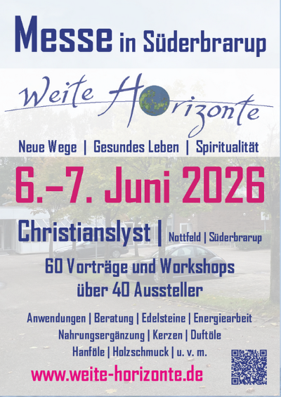Die Messe Weite Horizonte Christianslyst findet zum ersten Mal statt. Christianslyst ist ein großes, deutsch-dänisches Seminarhaus mit umfangreichem Außengelände. Es liegt nahe der Schlei bei Süderbrarup/Nottfeld. Termin: 06. und 07.06.26 von 10 – 18 Uhr. Ca. 40 Aussteller bieten vielfältige Möglichkeiten des entspannten Ausprobierens, Staunens und In-die-Tiefe-gehens mit ihren Ständen, Vorträgen und Workshops. Der Eintritt ist frei.